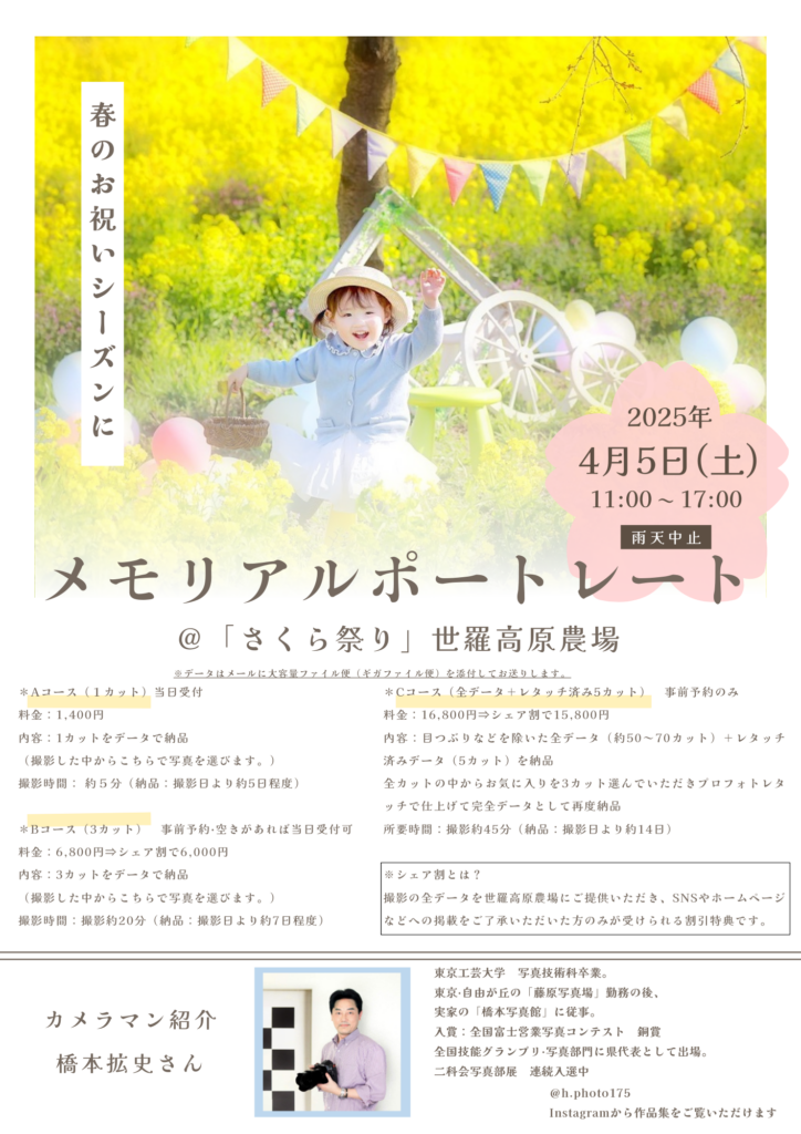 ・ご予約のキャンセルは電話にてイベント開催日の前日(2025年4月11日)15時までにお願いいたします。それ以降のお客様都合によるキャンセルにつきましては撮影料と同額のキャンセル料を請求いたします。