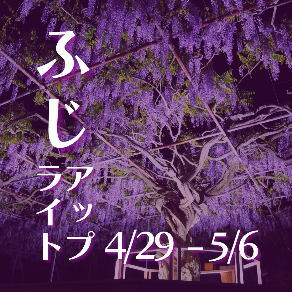 ふじとルピナスまつり会場では次の日程で期間限定のふじのライトアップを行います。妖艶なふじをお見逃しなくお楽しみください。