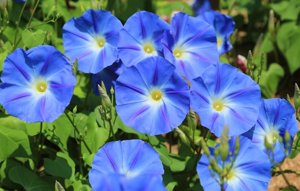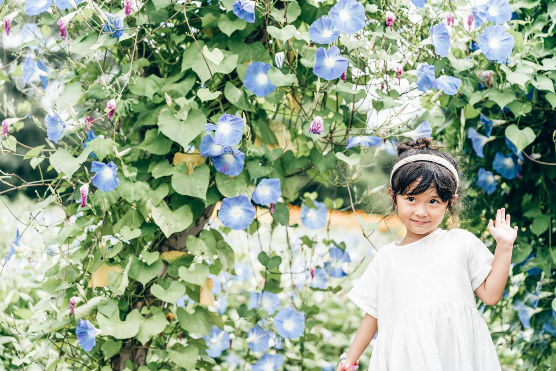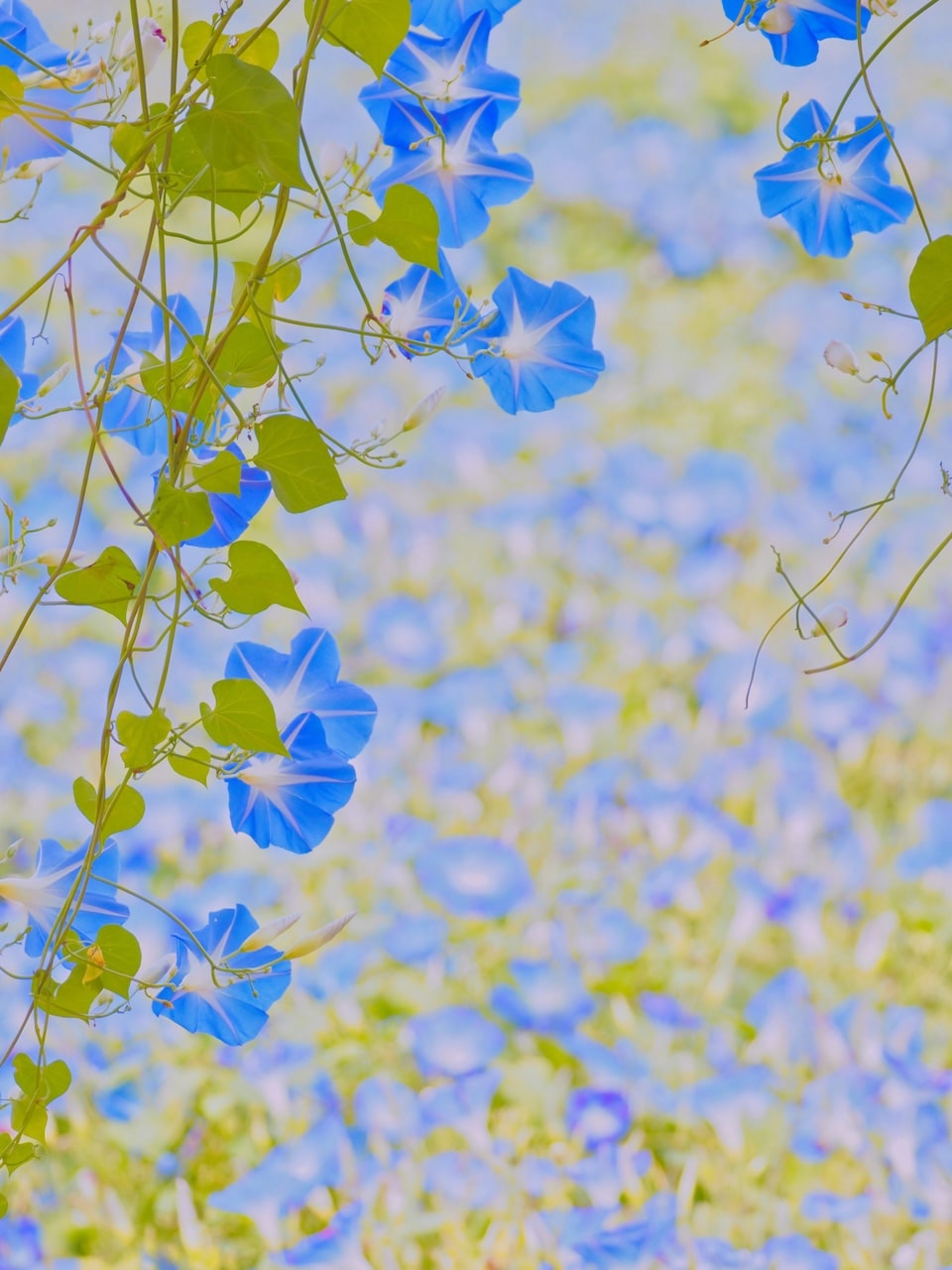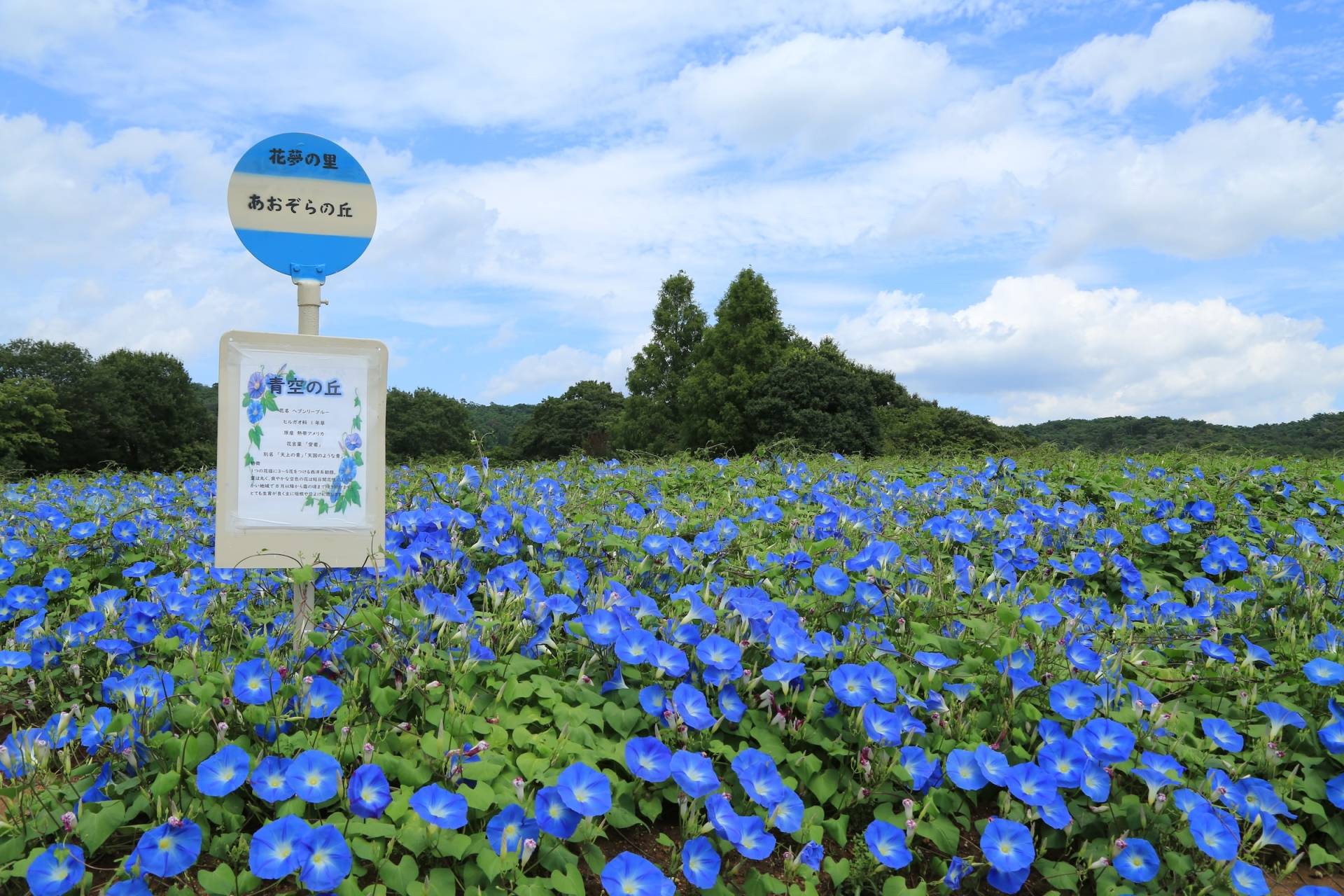 夏、西洋アサガオである「ヘブンリーブルー」の冴えるような青が花畑を覆い尽くします。