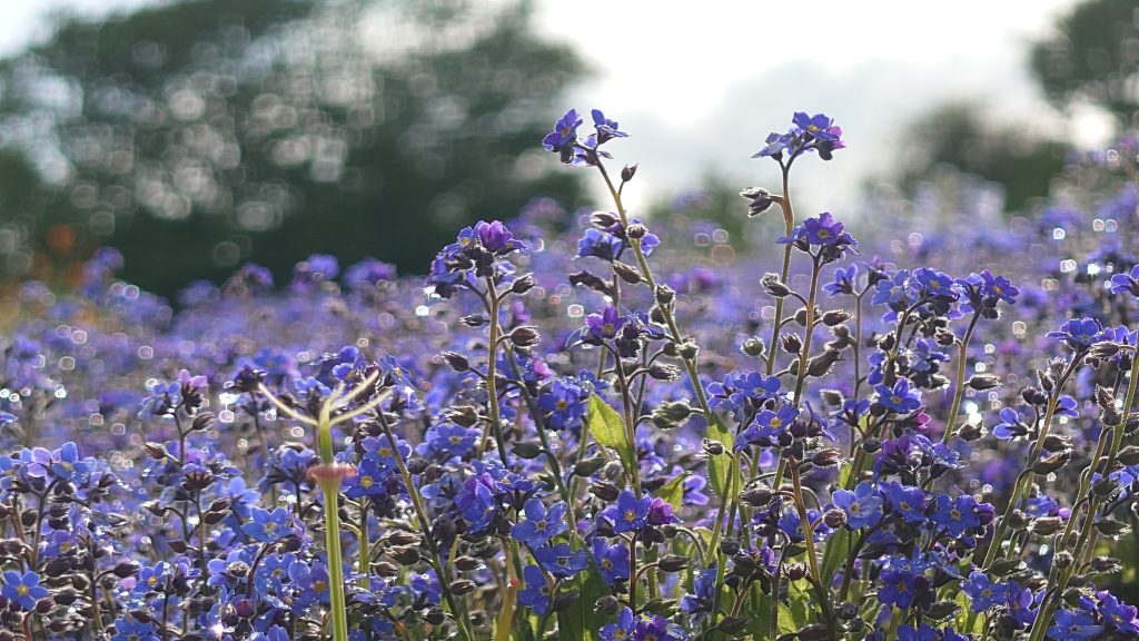 ネモフィラの下のパッチワークエリアでは、ほぼ全種類の花が咲いてきました。