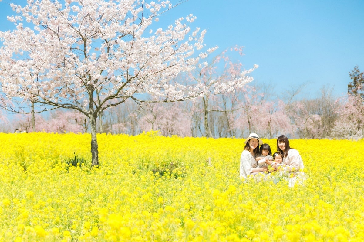 約30,000㎡の丘にふわりと降りそそぐ、淡いピンク色の桜たち。澄み切った青空と鮮やかな菜の花色も加わり、春の世羅高原を華やかに彩ります。