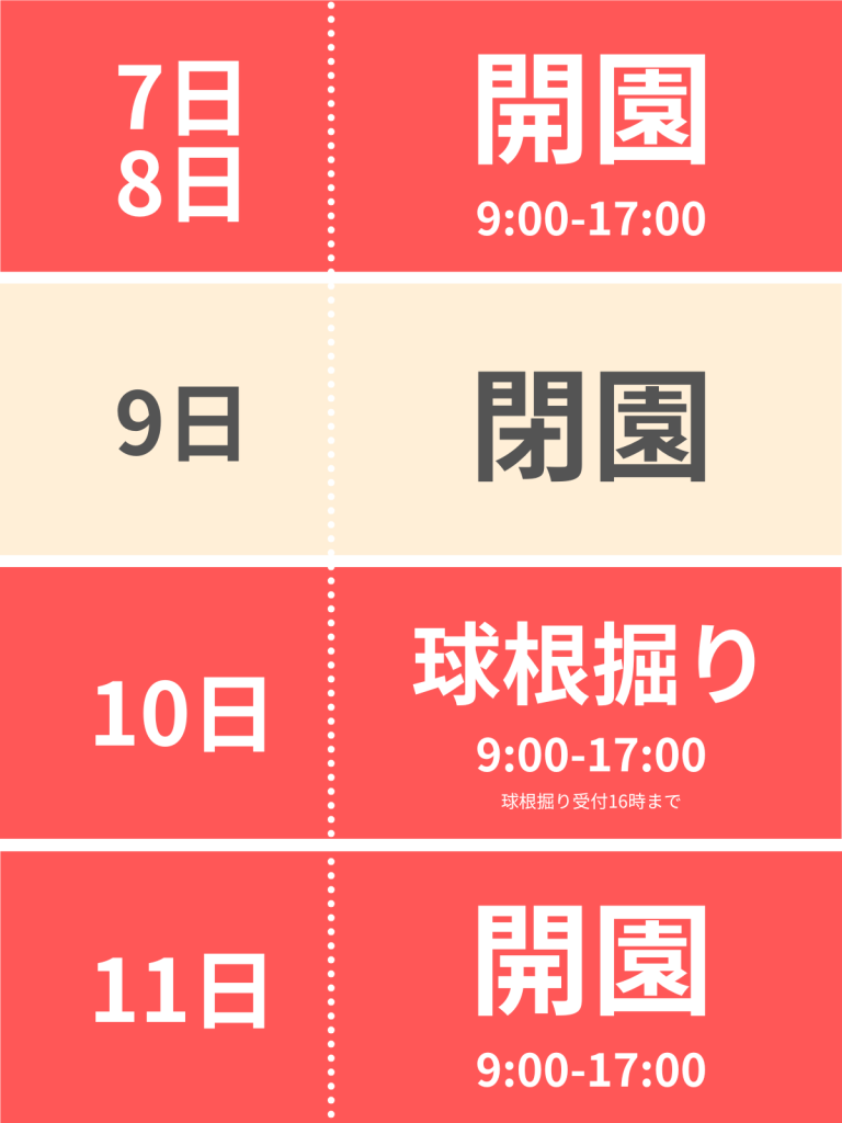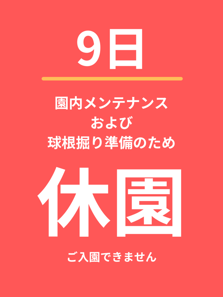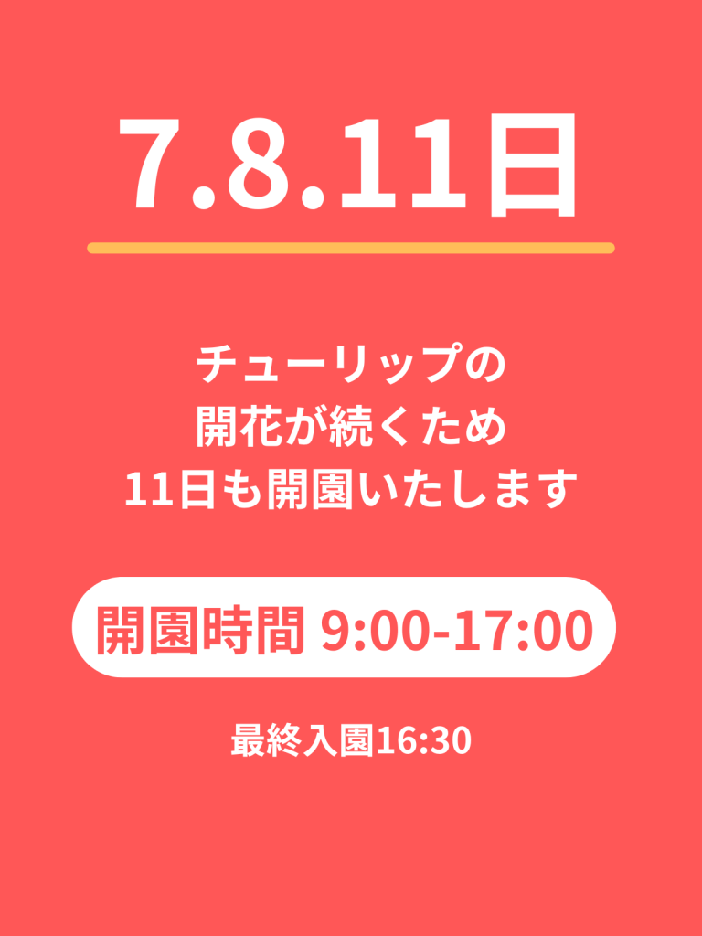 [繁体]【世羅高原農場】チューリップ祭 開園日延長 2025年5月6日 HOME » 世羅高原農場 » [繁体]【世羅高原農場】チューリップ祭 ... 5月7日以降の開園日・チューリップの球根掘りイベントについて ※5月9日はメンテンナンスおよび、球根掘り準備のため閉園いたします。 ご入園できませんのでお気を付けください。 ※いずれも開園時間は9:00‐17:00 最終入園は16:30までです。